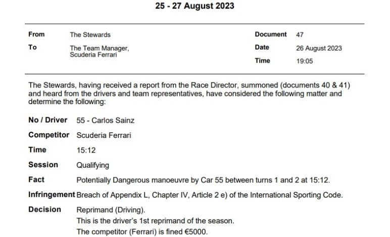 UFFICIALE- Ferrari sanzionata per la manovra di Sainz. Penalità anche tra gli impeding - UFFICIALE- Ferrari sanzionata per la manovra di Sainz. Penalità anche tra gli impeding
