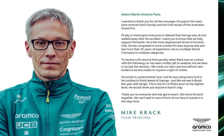 Aston Martin, lettera ai tifosi dopo la penalità: «Boccone amaro, Fernando fenomenale» - Aston Martin, lettera ai tifosi dopo la penalità: «Boccone amaro, Fernando fenomenale»