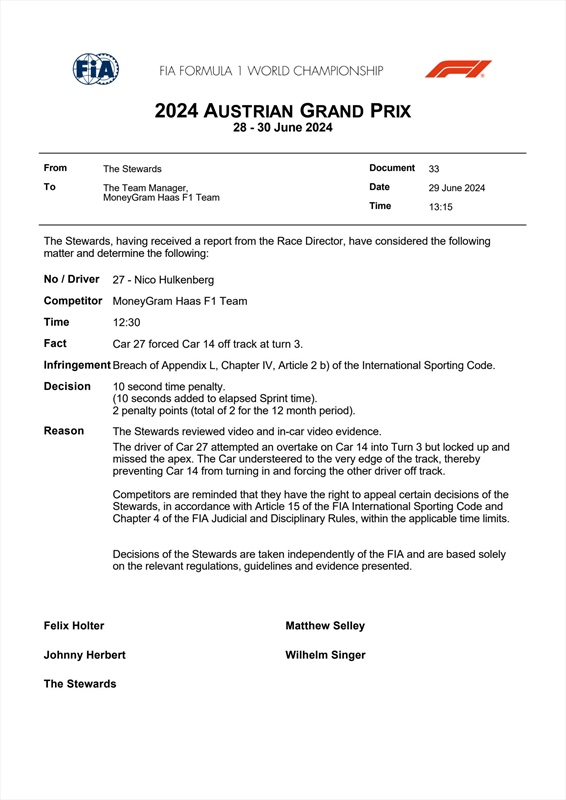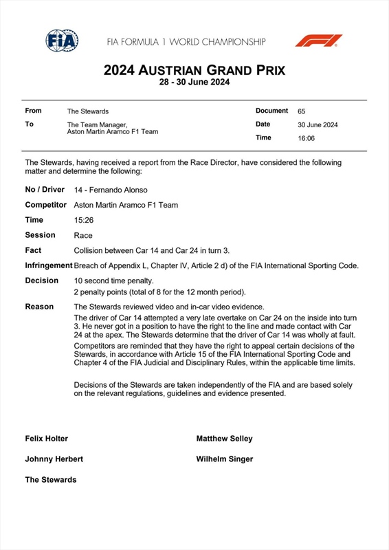 UFFICIALE - Due punti di penalità sulla patente ad Alonso per il contatto con Zhou - UFFICIALE - Due punti di penalità sulla patente ad Alonso per il contatto con Zhou