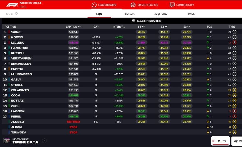 Masterclass di Sainz al GP del Messico. Norris blocca un'altra doppietta Rossa  - Masterclass di Sainz al GP del Messico. Norris blocca un'altra doppietta Rossa