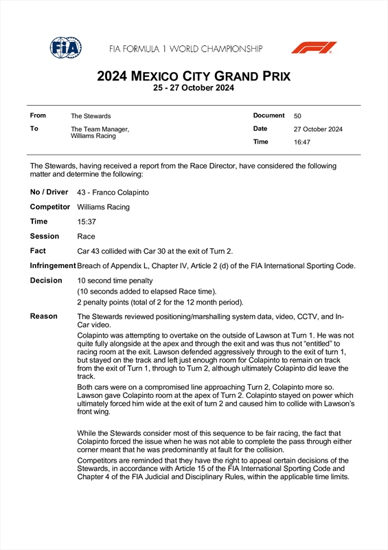 GP Messico - La FIA interviene con una penalità a fine gara: i dettagli - UFFICIALE - La FIA interviene con una penalità nel post-gara: i dettagli
