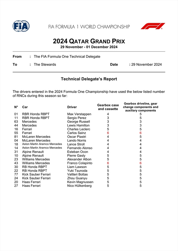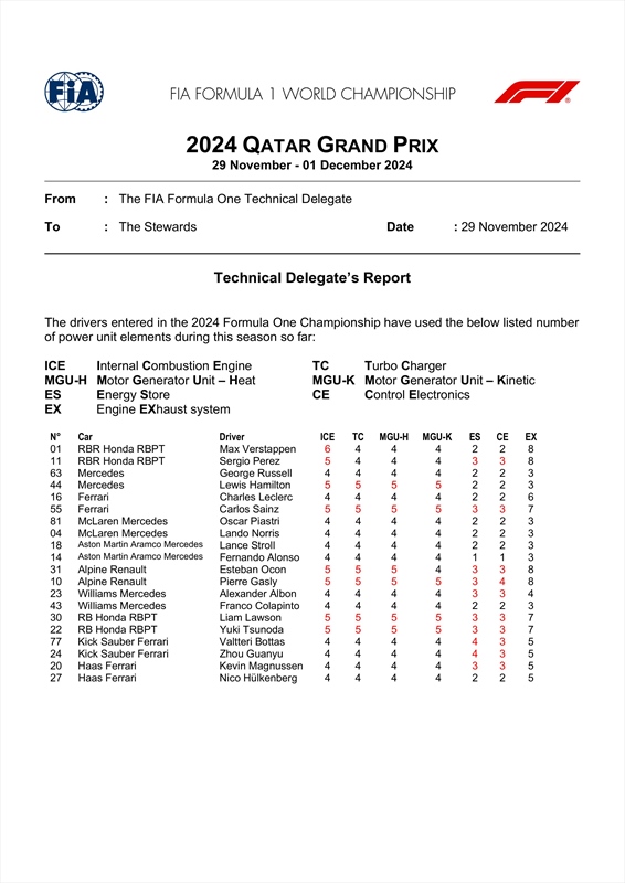 GP Qatar - Tabella ufficiale componenti Power Unit usate per pilota: solo cambi con penalità - GP Qatar - Tabella ufficiale componenti Power Unit usate per pilota: solo cambi con penalità