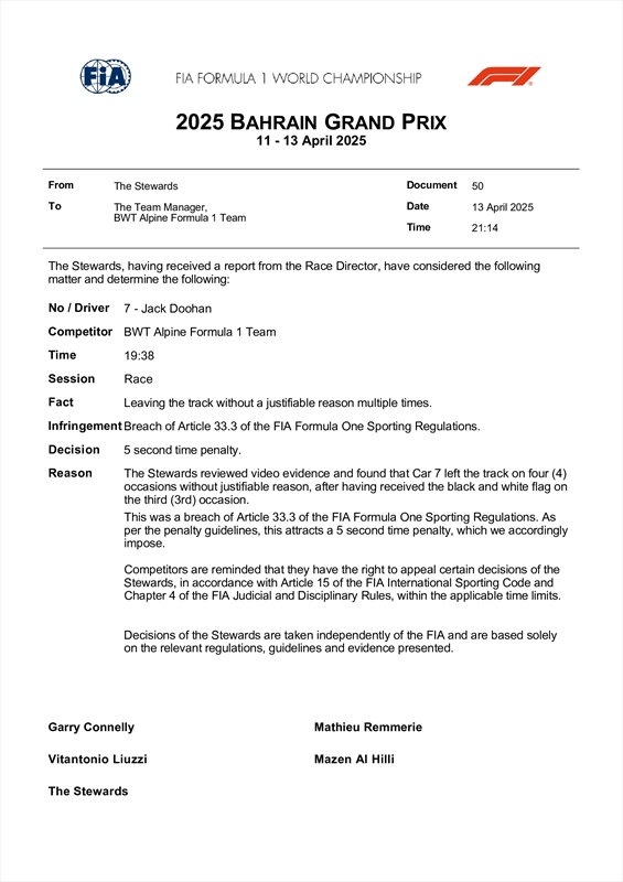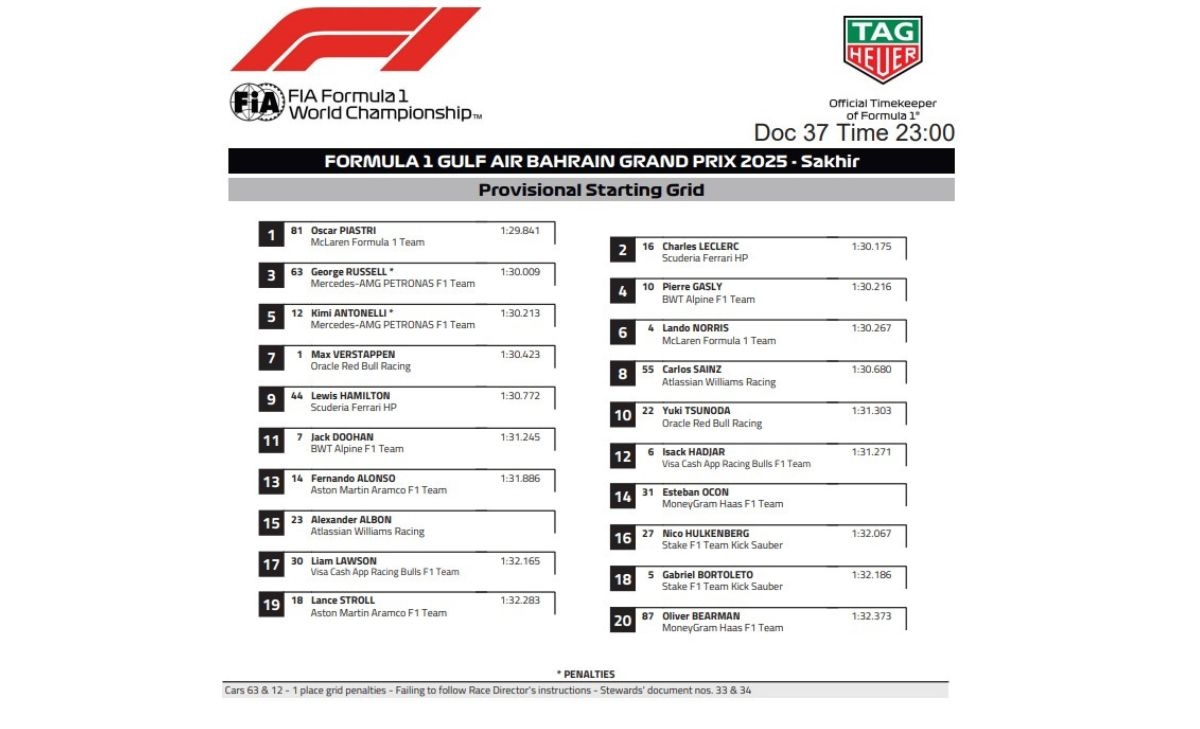 UFFICIALE - Una squalifica e due penalità in Bahrain, la FIA fa una strage: tutte le sanzioni - UFFICIALE - Una squalifica e tante penalità in Bahrain, la FIA fa una strage: tutte le sanzioni