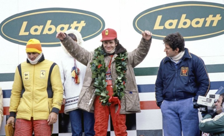 Sembra minuscolo, sul podio, alle prese con una gioia così grande; gigantesca la corona d'alloro, di qualche misura più grande il cappellino, solo appoggiato sui capelli che la maschera ignifuga aveva appiccicato sulla fronte. Quale bottiglia di champagne gli hanno dato, per brindare? Non è champagne, è la sua birra, quella che porta scritta anche sul casco, che si beve a casa sua. Non era mai accaduto, alla fine di un gran premio, che il vincitore brindasse con la birra. Tante cose, prima di Gilles Villeneuve, non erano mai accadute. Il suo paese se ne sta godendo una, mentre il suo sguardo lo abbraccia, dall'alto del primo gradino di un gran premio di Formula Uno.