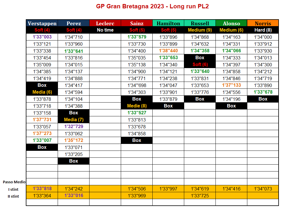 Come potete osservare dalla tabella riportata in basso, Carlos ha un buon inizio, ma poi i tempi salgono attorno all'1'35'' e da lì in poi per lui sarà molto difficile abbassarli. Anche Checo non riuscirà ad avere uno stint propriamente competitivo. Quello che riesce a gestirle meglio è Verstappen, seguito da vicino da un ritrovato Lewis Hamilton. Russell si è molto lamentato del passo gara a fine sessione, ma forse non riusciva ancora ad avere un quadro completo della situazione. Il ritmo sulle Medie è abbastanza da dimenticare, ma poi, neanche dopo tanti giri, la situazione migliora vistosamente sulle Soft, mostrando un ritmo migliore di Sainz su Medie.