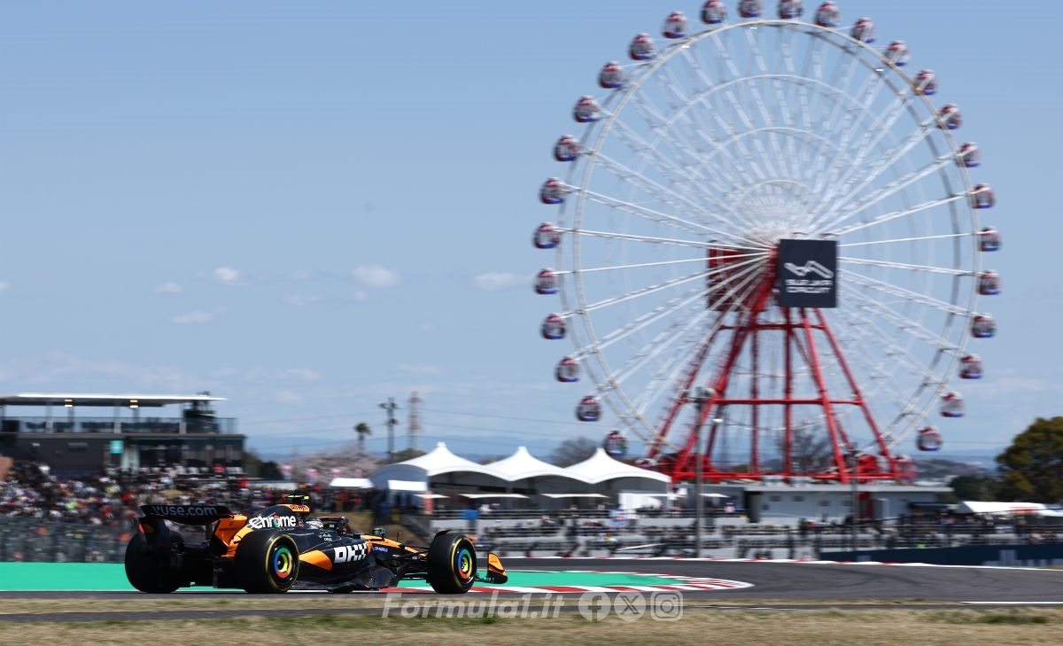 Guardando invece la colonnina dei tempi, rispetto a Shanghai quasi nulla sembra essere cambiato. Davanti a tutti ha concluso la McLaren con Lando Norris che, proprio durante gli ultimi minuti è riuscito a fermare il cronometro sull'1:28.549. Alle sue spalle ha poi concluso George Russell che ha portato la sua Mercedes a poco più di un decimo dal connazionale facendo segnare un crono di 1:28.712. A chiudere il podio giapponese della FP1 ci ha pensato poi Charles Leclerc che, staccato di oltre quattro decimi dalla pole position ha messo a segno un tempo sul giro di 1:28.965.