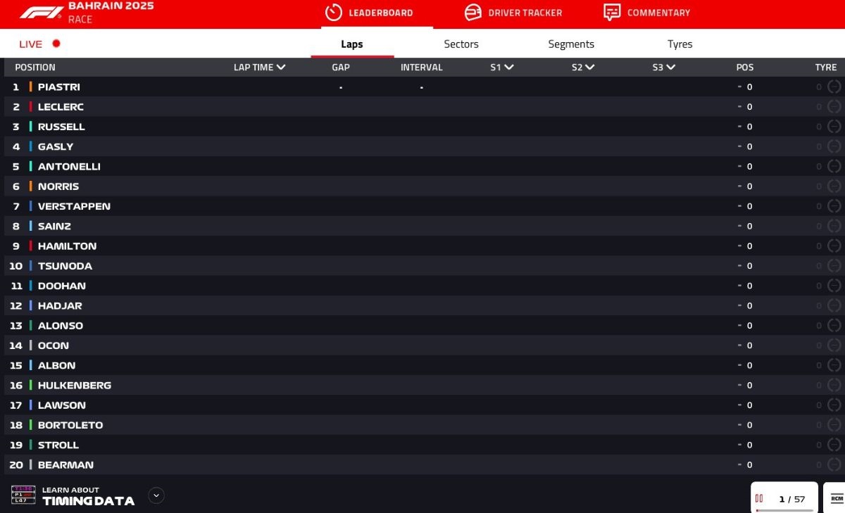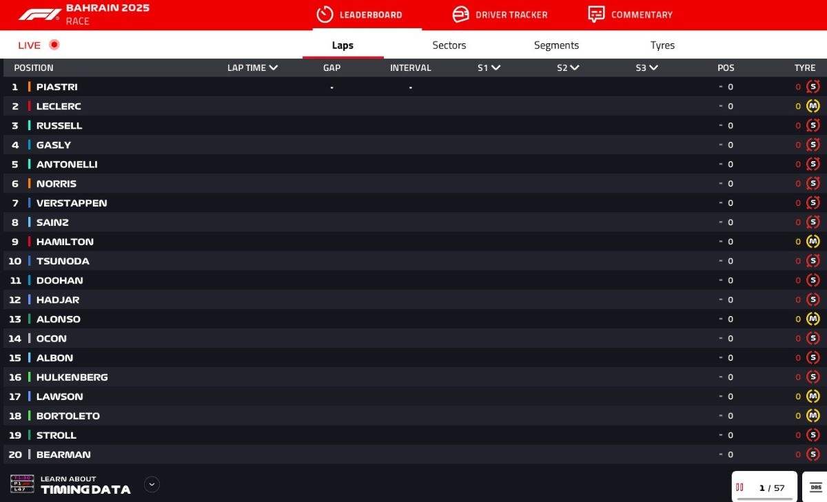 Segui la diretta del Gran Premio del Bahrain 2025. Cronaca in tempo reale, infografiche, statistiche, commenti e immagini dal circuito. Segui il GP con la diretta testuale di Formula1.it da PC e smartphone, minuto per minuto fino alla bandiera a scacchi.