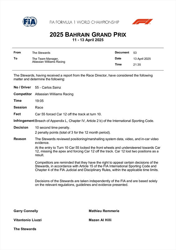 Carlos Sainz ha ricevuto 10 secondi di penalità e 2 punti sulla patente per "aver spinto un altro pilota fuori dalla pista". L'episodio l'ha visto protagonista con Kimi Antonelli alla curva 10, ma non ha influito sul risultato finale, in quanto il pilota Williams si era comunque ritirato per danno alla pancia dopo un contatto con Yuki Tsunoda.