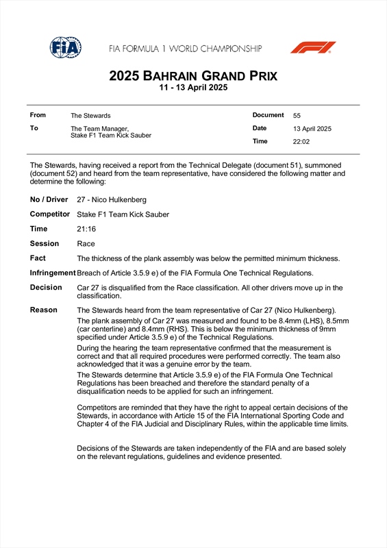 La Sauber di Nico Hulkenberg è stata, infine, squalificata per eccessiva usura dello skid, esattamente quanto successo a Hamilton in Cina.