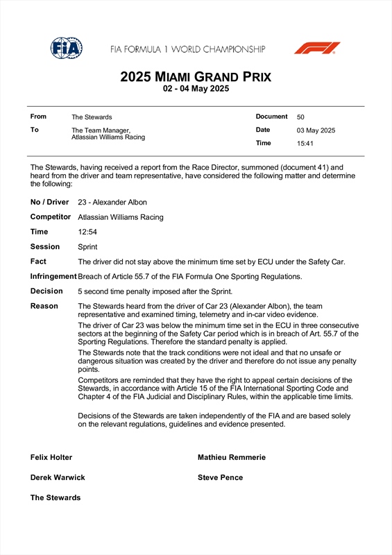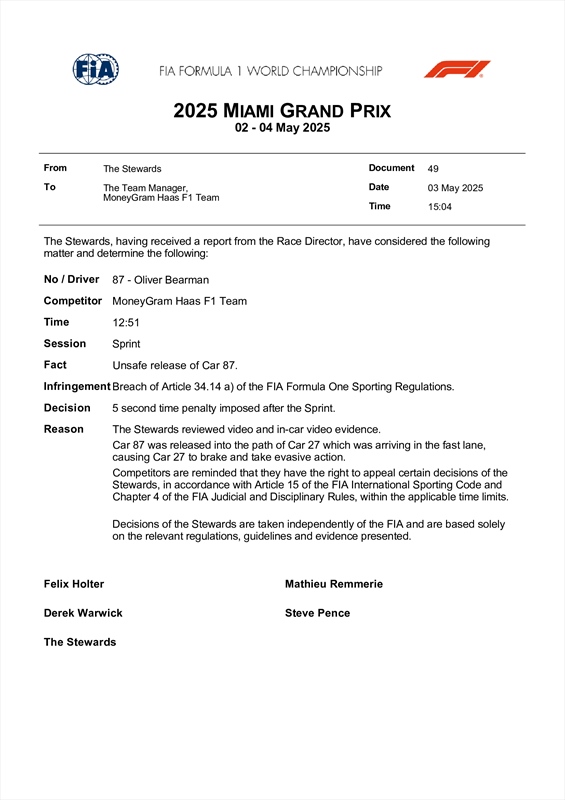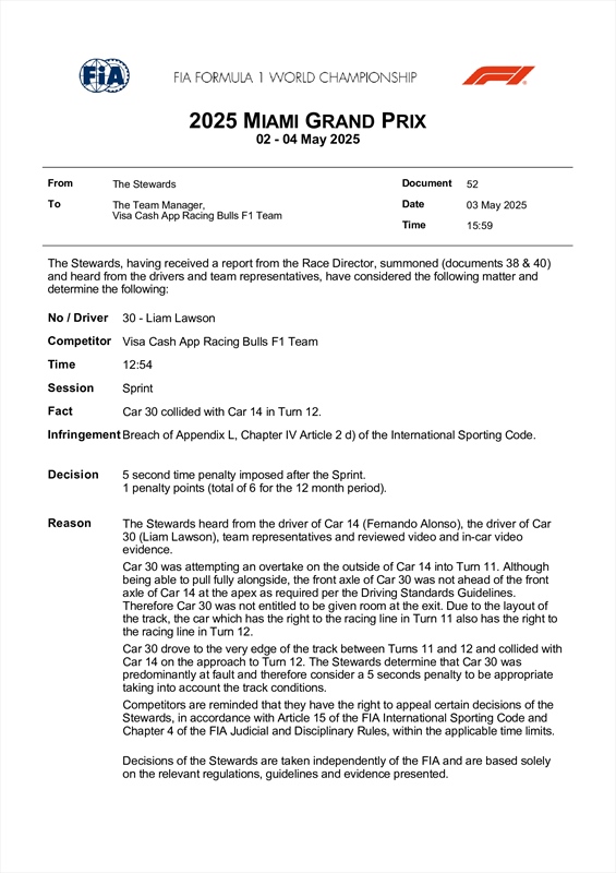 A seguito di queste decisioni, i primi otto classificati della Sprint del Gran Premio di Miami - ovvero tutti coloro che compongono la zona punti - sono in ordine: Norris, Piastri, Hamilton, Russell, Stroll, Tsunoda, Antonelli, Gasly.