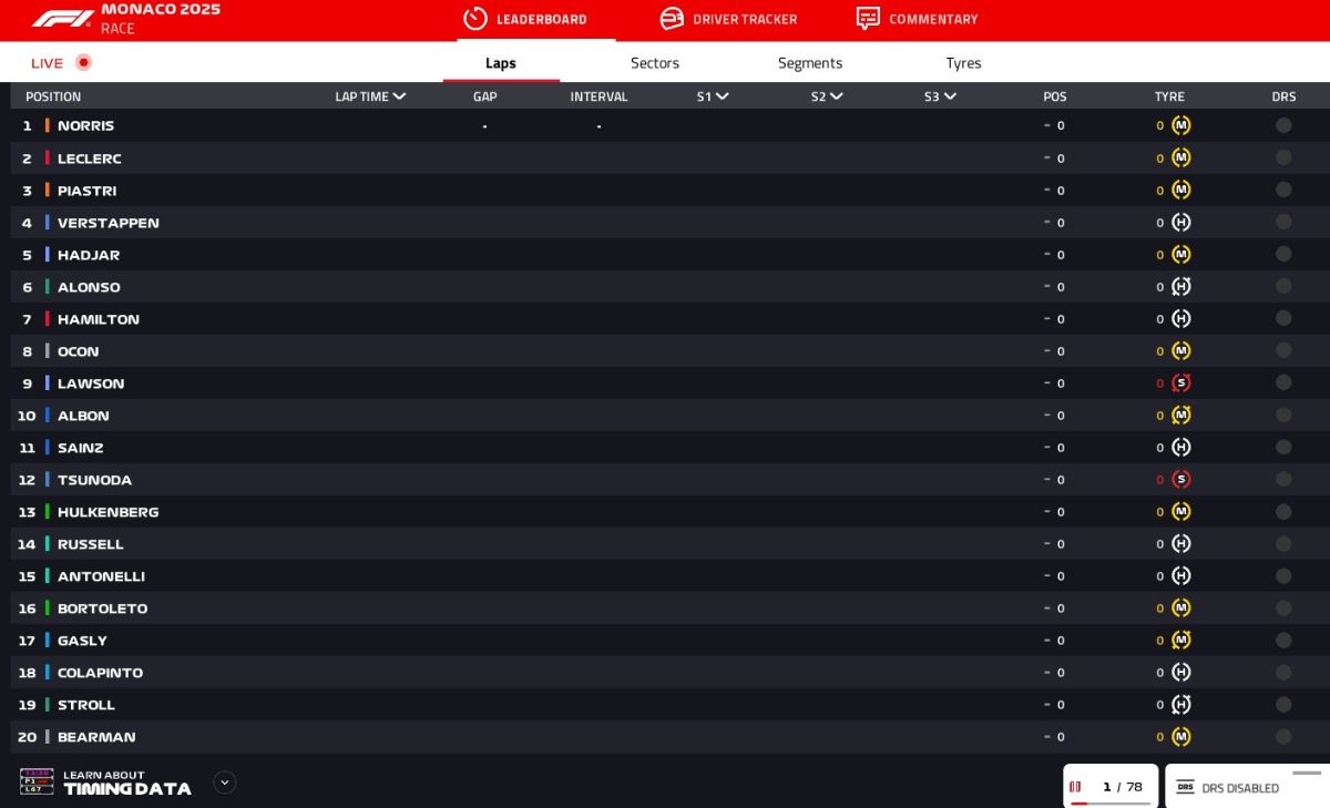 Segui la diretta del Gran Premio di Monaco 2025. Cronaca in tempo reale, infografiche, statistiche, commenti e immagini dal circuito. Segui il GP con la diretta testuale di Formula1.it da PC e smartphone, minuto per minuto fino alla bandiera a scacchi.