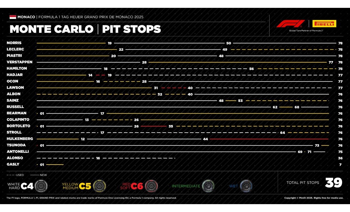 Grazie alle due soste vi dobbiamo rendere conto di diverse strategie: M-H-H per Norris e Piastri, M-H-M per Leclerc e Bearman, H-M-S per Verstappen (per lui un solo giro su C6 nel finale), H-H-M per Hamilton e Stroll, M-S-H per Hadjar (primi stop molto anticipati) e Lawson ((primo pit ritardato), M-M-H per Ocon e Albon, H-M-M per Sainz (primo pit molto ritardato) e Colapinto, H-M-H inspiegabile per le due Mercedes, M-H-M per Bearman che giunge 12° con pit stop al primo giro, M-H-S-M per Bortoleto, l’unico su tre soste e infine S-H-M per Tsunoda che arriva 17° dietro alle Racing Bulls, lontano dai punti. Ritirati Alonso e Gasly.