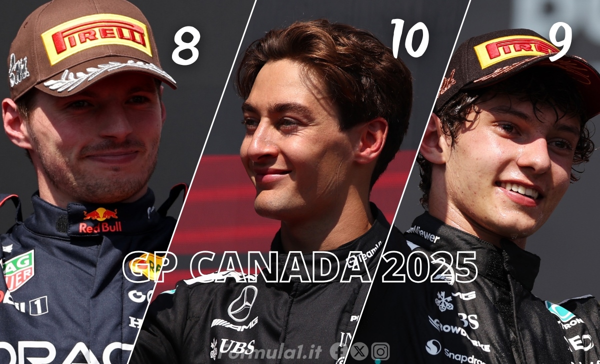 Arrivato alla 54° edizione, il GP del Canada è uno degli eventi maggiormente storici e ben radicati del calendario di F1, oltre che tra i più apprezzati dal pubblico. Come da previsioni, l'evento alle porte di Montreal ha regalato una buona quantità di azione, sia grazie ai duelli in pista che alle strategie: nei 70 giri utili per l'assegnazione dei punti iridati, la lotta per la vittoria è stata scontata, a differenza di quella per altre piazze, dal podio fino al fondo del gruppo, rivelandosi giocata sia sulle tattiche che sui duelli corpo a corpo che, va detto, hanno regalato non poche sorprese. Al termine del GP sul tracciato dedicato a Gilles Villeneuve, decimo round 2025, ad imporsi è stato George Russell su Mercedes, seguito dalla Red Bull di Max Verstappen e dalla Mercedes di Kimi Antonelli. Analizziamo il rendimento di team e piloti con le pagelle.