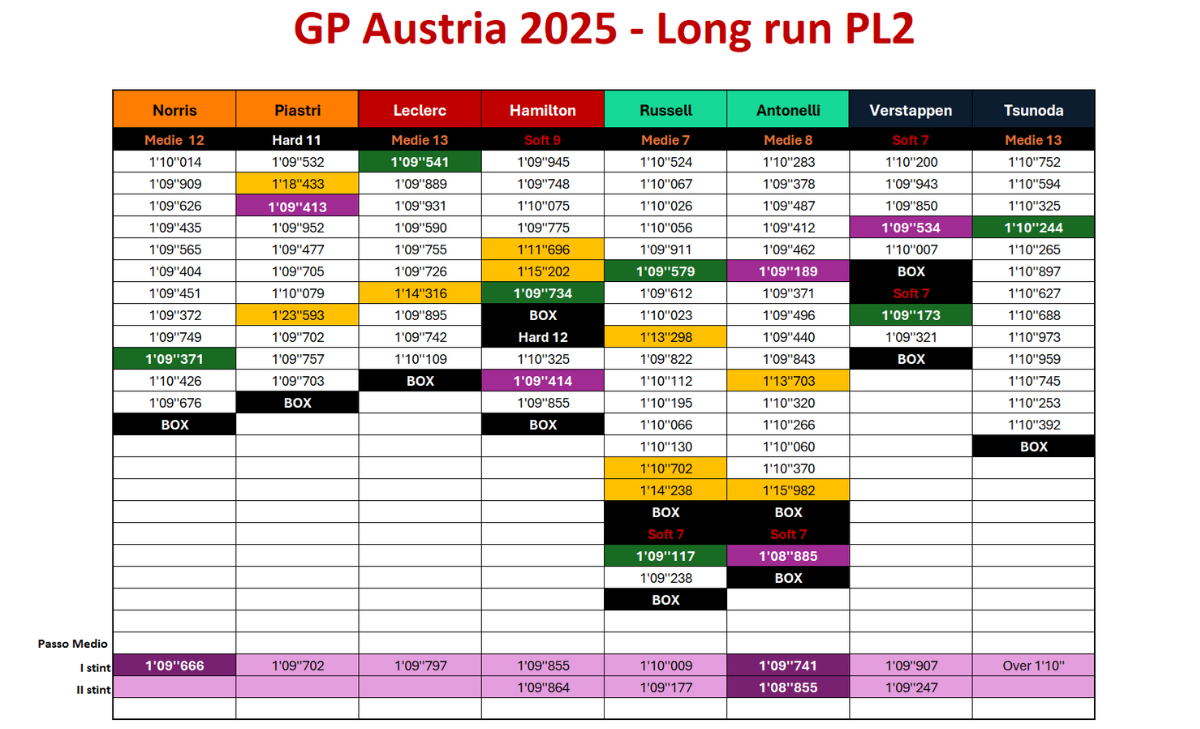 Perché però indichiamo Antonelli come osservato speciale? Perché la Mercedes ha fatto tantissimi giri sulle Medie e se togliessimo le ultime 3 o 4 tornate percorse dal calcolo del ritmo del bolognese otterremo un tempo molto migliore rispetto a quello di Norris. Questo ci fa protendere a pensare che la vettura di Kimi fosse più scarica di quella di Lando, però non possiamo prendere sottogamba il lavoro fatto oggi dall’italiano, soprattutto dopo il bel risultato del Canada. Vincere sarà complicato per gli alfieri Mercedes, però tutto può succedere.