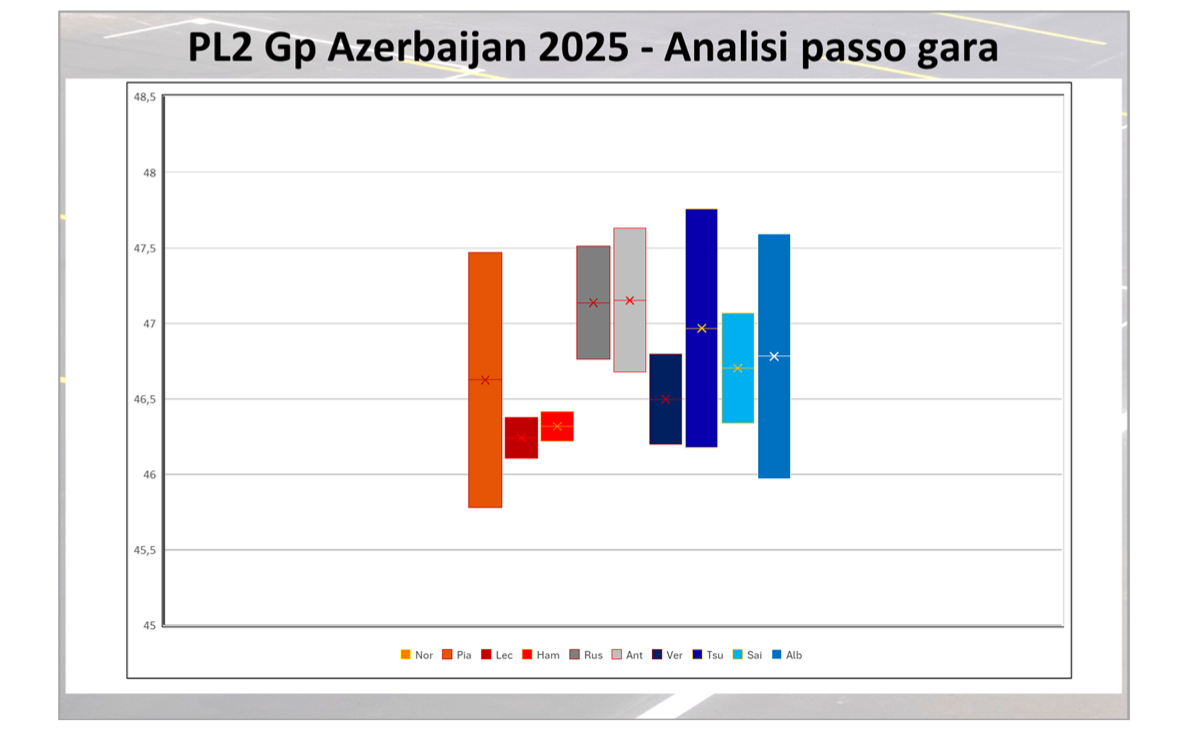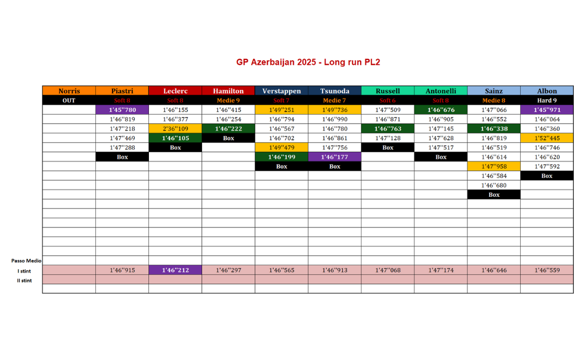 Attenendoci, in prima istanza, al nostro copione, andiamo a dare uno sguardo ai tempi effettuati dai piloti durante i long run. Con le libere 1 che hanno subito una riduzione a causa di una lunga bandiera rossa, resasi necessaria per sistemare i cordoli, i conducenti hanno preferito girare per lo più scarichi per prendere maggiore confidenza in vista della qualifica (molto importante nonostante il lungo rettilineo che chiude il terzo settore) e hanno dedicato solamente gli ultimi dieci minuti alla simulazione della gara. Norris il grande assente. Lando ha avuto un impatto contro il muro durante la sessione rovinando irreparabilmente la sospensione posteriore. Il britannico è riuscito a riportare la vettura ai box, ma i danni erano troppo importanti da permettere ai meccanici di riparare in tempo la vettura.