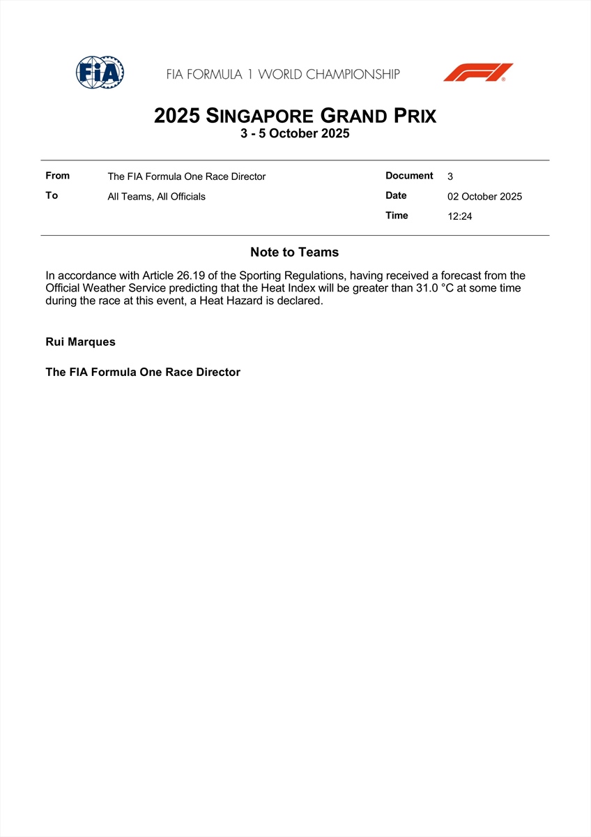 La FIA ha emesso una nota ufficiale in vista del Gran Premio di Singapore 2025, dichiarando la condizione di Heat Hazard. Si tratta di una procedura prevista dall’Articolo 26.19 del Regolamento Sportivo, che scatta quando l’indice di calore (Heat Index) previsto dal servizio meteorologico ufficiale supera i 31°C durante l’evento.