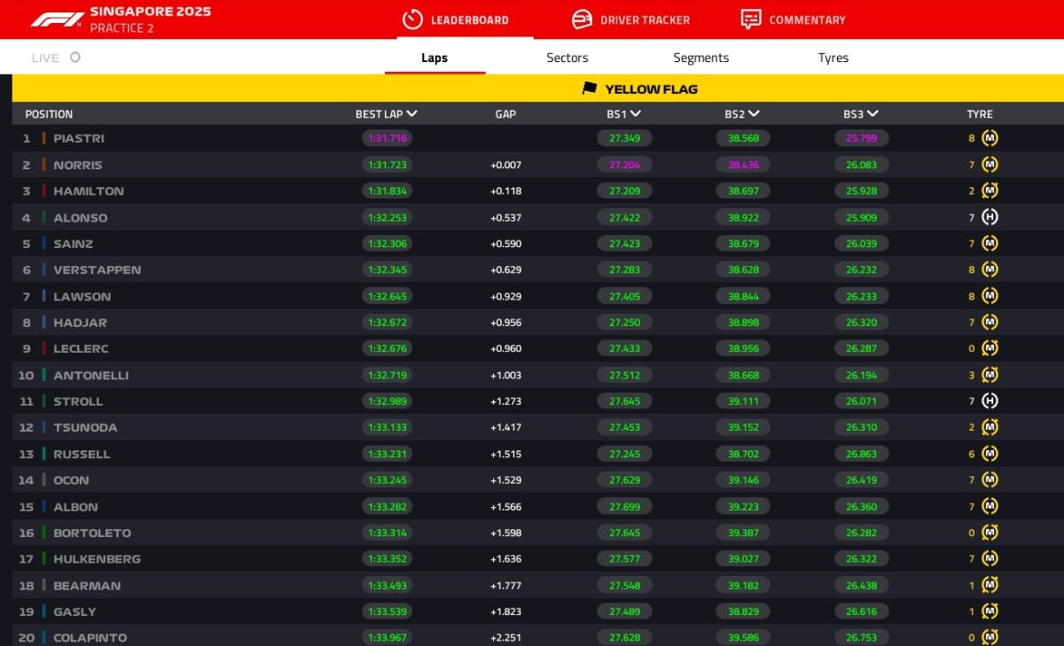 15:11 - Norris detta il ritmo: 1'32''226, poi Piastri 1'32''739, Sainz 1'32''791, Alonso 1'32''855 (H), Antonelli 1'32''883, Hamilton 1'32''970.
