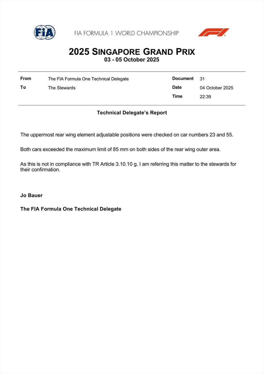 Secondo quanto riportato nel documento ufficiale n. 31 del delegato tecnico Jo Bauer, le verifiche hanno evidenziato che le due monoposto, numeri 23 e 55, hanno superato il limite massimo consentito di 85 mm nella zona esterna dell’ala posteriore. Tale irregolarità configura una possibile violazione dell’articolo 3.10.10 g del Regolamento Tecnico FIA di Formula 1.