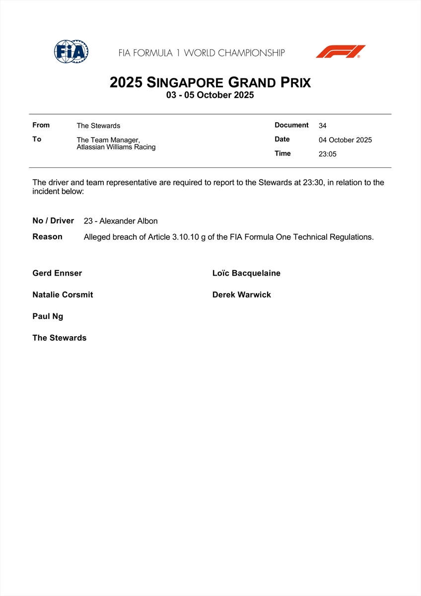 I commissari hanno quindi convocato per le ore 23:30 il team manager della Williams insieme ai due piloti per fornire spiegazioni in merito. La riunione determinerà se ci sarà una sanzione, che potrebbe arrivare fino alla squalifica dei risultati ottenuti in qualifica o alla partenza dal fondo della griglia.