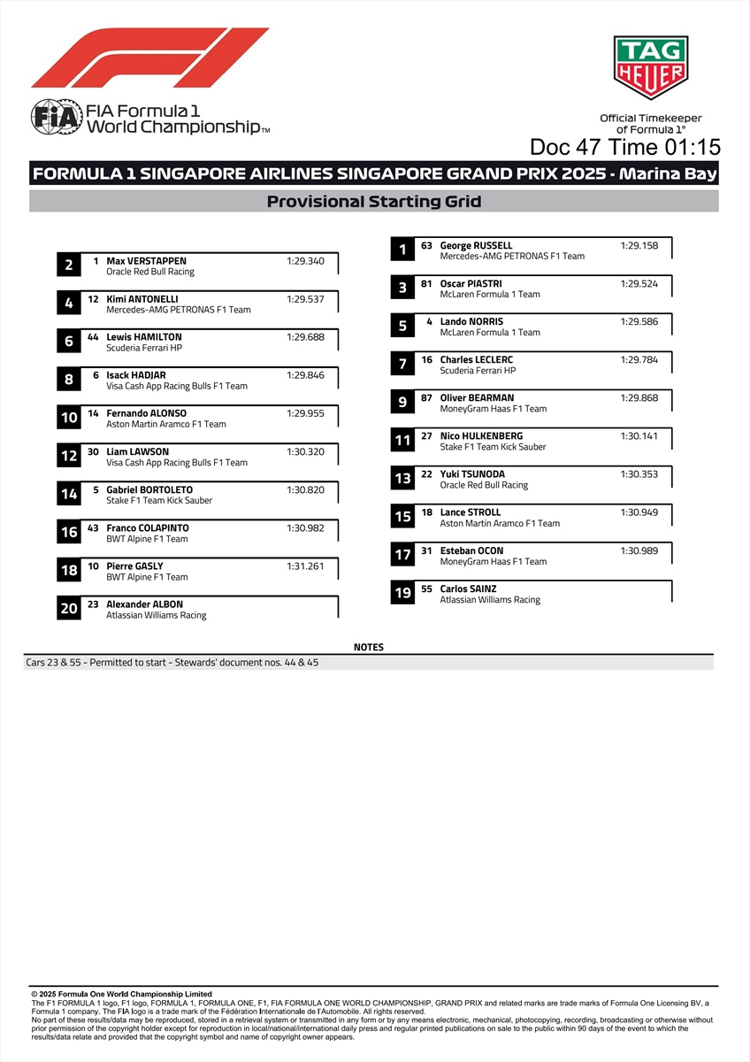 Tabella completa dei tempi delle Qualifiche del Gran Premio di Singapore 2025