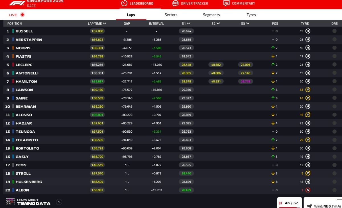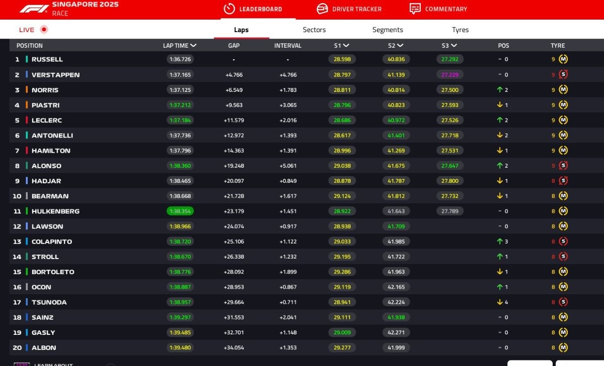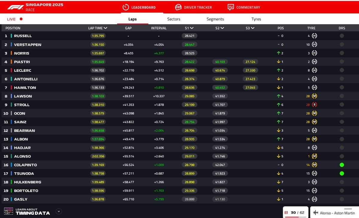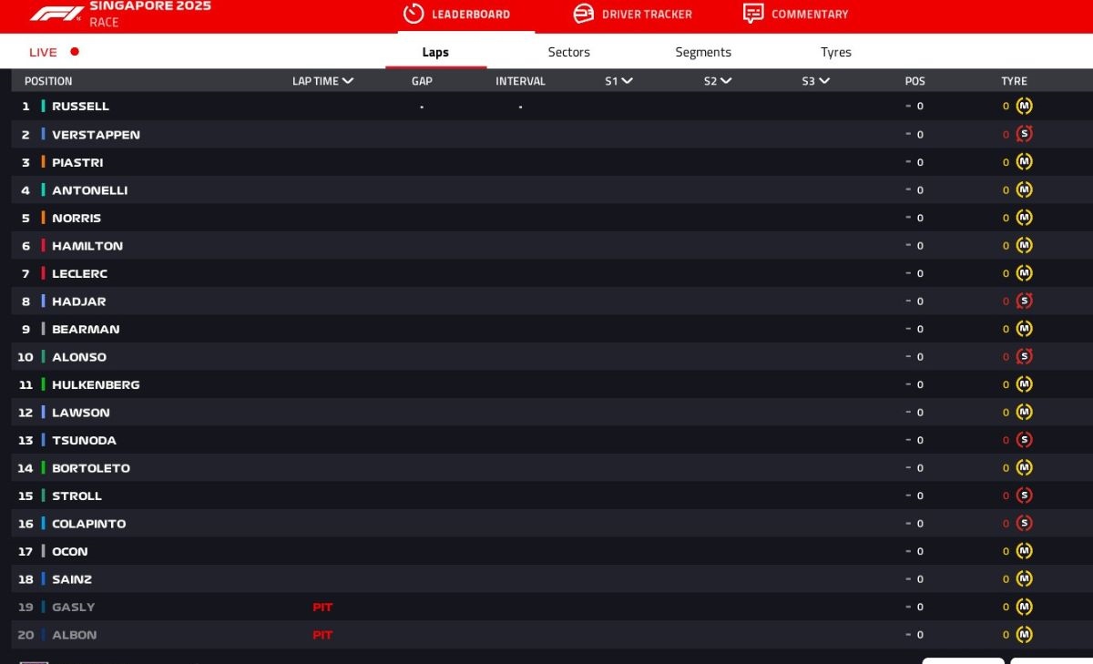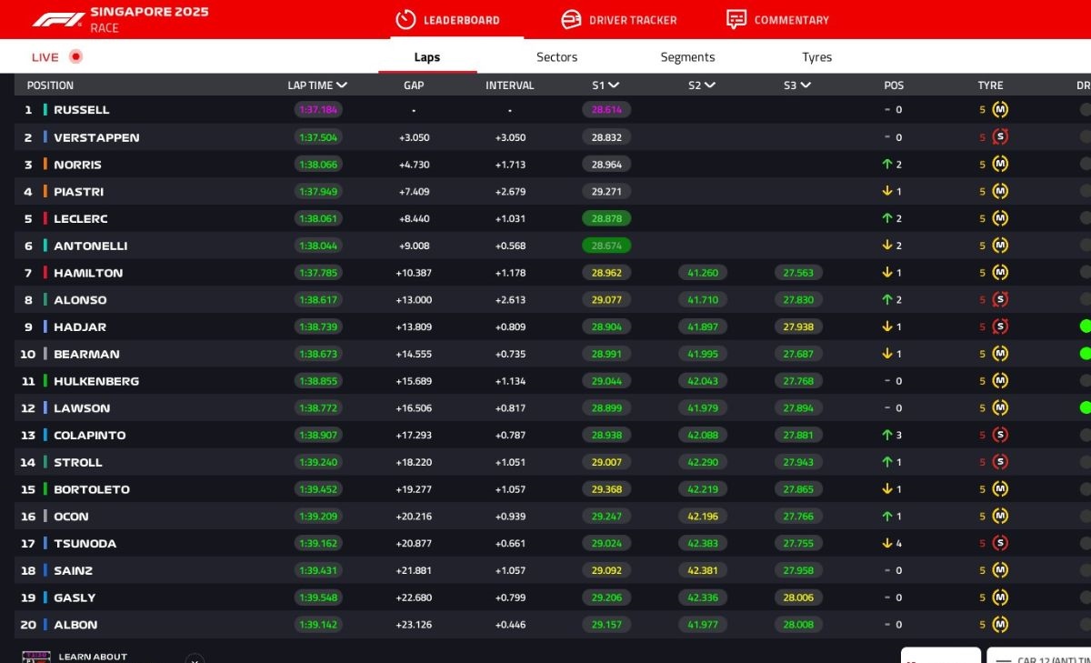 Segui la diretta del Gran Premio di Singapore 2025. Cronaca in tempo reale, infografiche, statistiche, commenti e immagini dal circuito. Segui il GP con la diretta testuale di Formula1.it da PC e smartphone, minuto per minuto fino alla bandiera a scacchi.