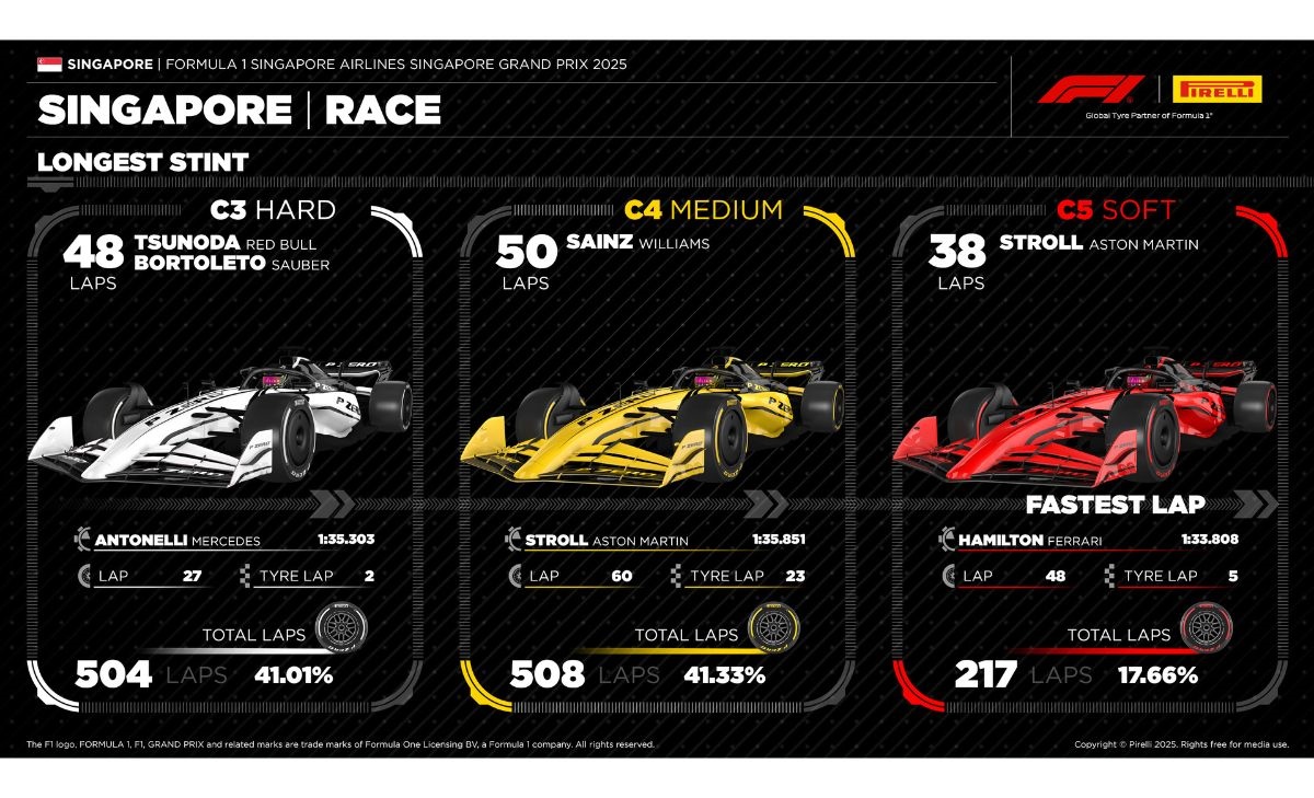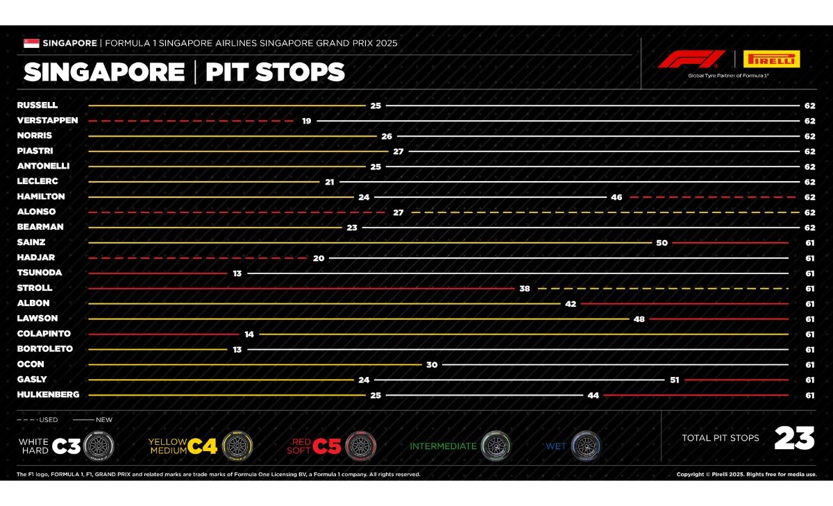Le strategie più interessanti a una sosta hanno riguardato l’esclusione della mescola Hard C3. Alonso, nonostante un problema ai box, mediante Soft-Medium, è riuscito a risalire fino all’ottava posizione (diventerà settima a causa della penalità di 5’’ comminata a Hamilton). Sulla stessa tattica Stroll e Colapinto. Molto bene anche Sainz su Medium-Soft, capace di chiudere decimo, nonostante l’inizio dal fondo dello schieramento (gara magistrale la sua). Sulla stessa linea del nativo di Madrid abbiamo avuto Albon e Lawson.
