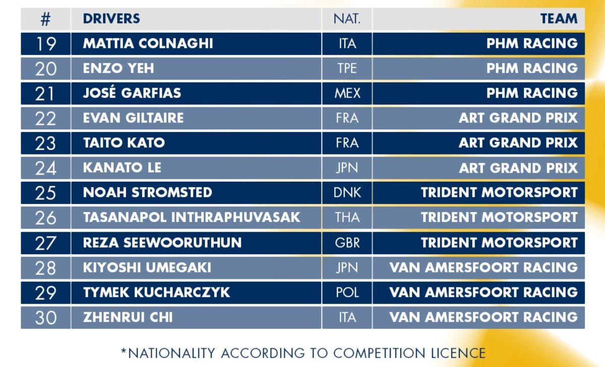 Per quanto riguarda l'Italia, oltre al talentino britannico Freddie Slater, attuale leader della Formula Regional Europea che gareggerà con Prema prima di approdare in Formula 3 con Trident, troviamo Matteo De Palo e Mattia Colnaghi, entrambi pronti a fare il salto di categoria nel 2026. Ecco tutti i nomi che vedremo battagliare tra poco più di un mese a Macau.