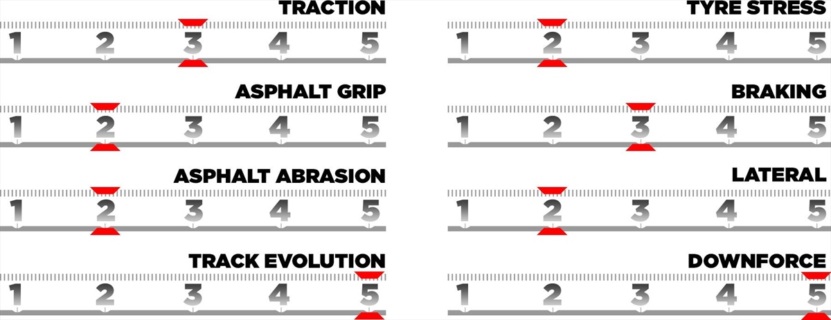 L'anno scorso, la Soft è entrata in gioco solo nelle qualifiche e poi in gara, solamente quando i piloti hanno tentato di assicurarsi il punto extra per il giro veloce, ma ora lo scenario potrebbe cambiare notevolmente. Il vantaggio offerto dalla C4 e dalla C5 potrebbe infatti portare i team a puntare su una gara prevalentemente con queste mescole. Tuttavia, ciò comporta il rischio di dover effettuare un secondo pit stop a causa del degrado. Chi sceglie la C2 potrebbe gestire in modo relativamente comodo uno stint più lungo, puntando a una sola sosta prima del traguardo, anche se ciò comporterà una riduzione delle prestazioni.