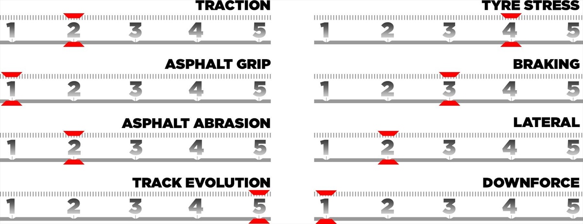 La decisione di non optare per un trio più morbido è stata dettata dal rischio di graining, prevalente sin dalla prima edizione di questa gara, che potrebbe compromettere eccessivamente l'efficienza della mescola più morbida della gamma attuale.