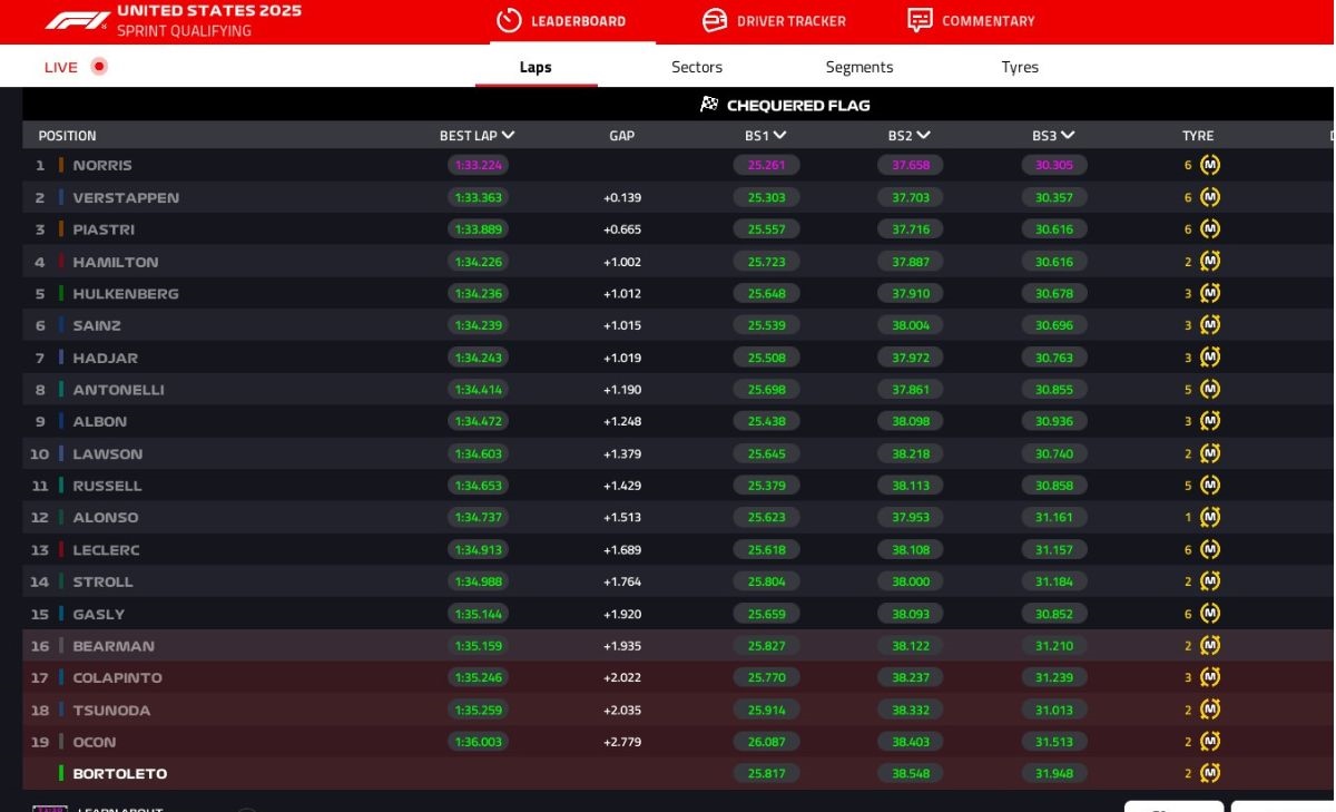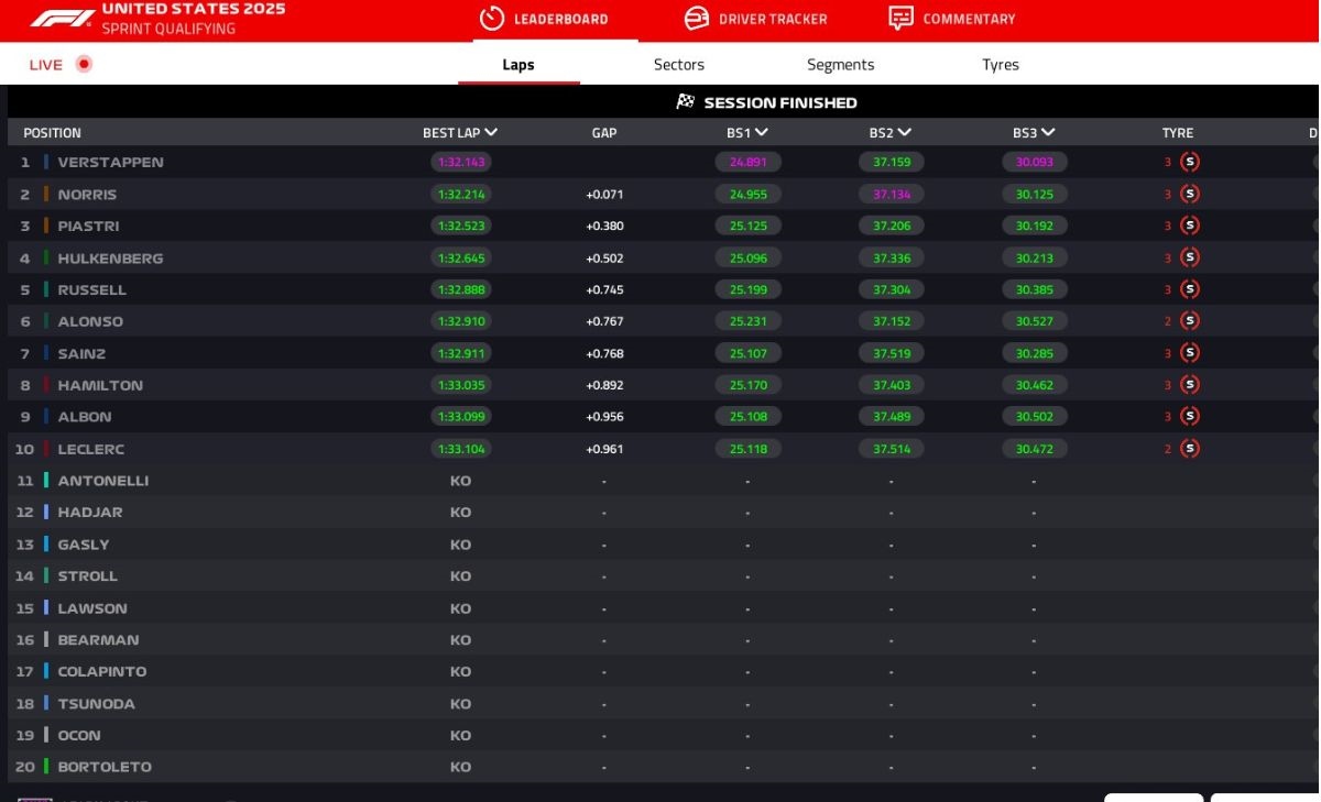 00:25 - Termina qui la Qualifica Sprint in Texas. Purtroppo non un circuito che si sposa bene alle caratteristiche della SF-25. Molto bene Verstappen e Hulkenberg, soprattutto il tedesco autore di un risultato inattesa.
