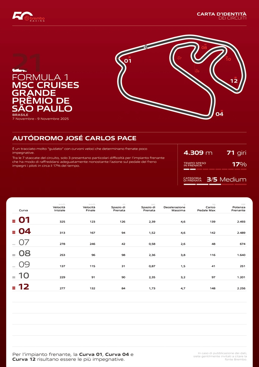 Questo è il terzo dei sei approfondimenti che proponiamo regolarmente su formula1.it per accompagnare l’avvicinamento a ogni weekend di gara: oltre all'analisi Brembo, trovano spazio lo studio e le informazioni Pirelli, la programmazione TV e streaming dell’evento, gli aggiornamenti ufficiali, le prime immagini e i setup dalla pitlane, oltre alla tabella delle componenti della power unit utilizzate, utile per valutare possibili penalità in griglia per il GP del Brasile 2025.