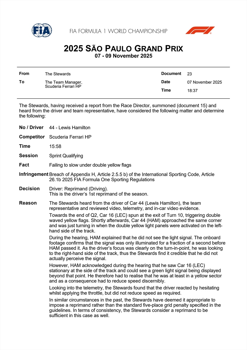 La FIA ha comunicato le decisioni dei Commissari Sportivi in merito all’investigazione su Lewis Hamilton durante la Sprint Qualifying del Gran Premio di San Paolo 2025. Il pilota della Ferrari è stato richiamato ufficialmente per non aver rallentato a sufficienza sotto doppia bandiera gialla, esposta in seguito al testacoda di Charles Leclerc in Q2.