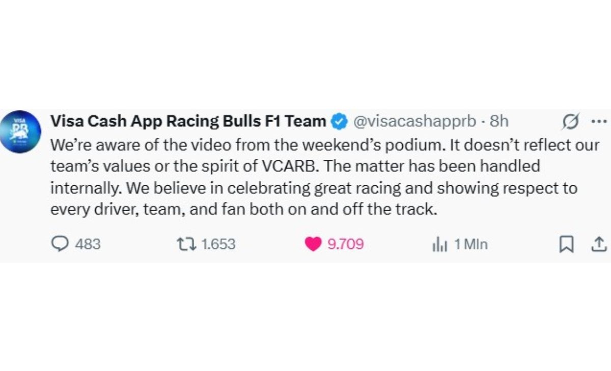 “Siamo a conoscenza del video girato sul podio questo fine settimana. Non riflette i valori del nostro team né lo spirito del VCARB. La questione è stata gestita internamente. Crediamo nel celebrare le grandi corse e nel mostrare rispetto a ogni pilota, team e tifoso, sia in pista che fuori”, si legge appunto nella nota rilasciata tramite i social della scuderia italiana.