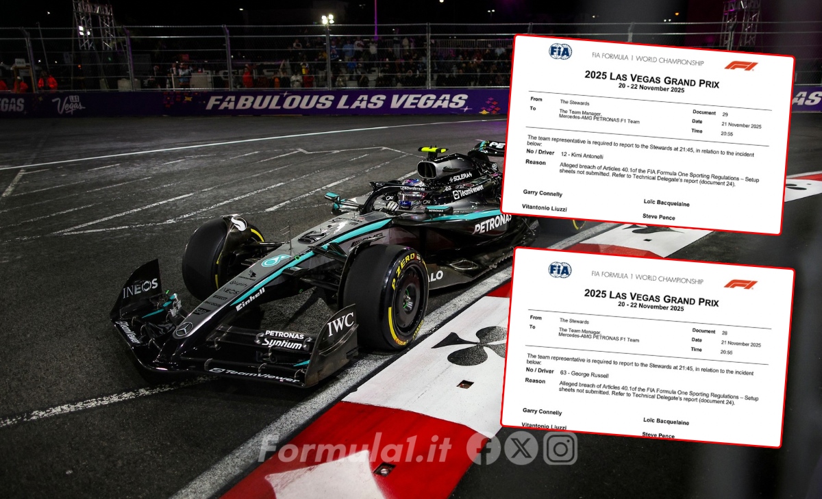 Ha dell'incredibile quanto accaduto a Las Vegas pochi minuti fa. La FIA ha richiamato entrambe le Mercedes poiché alle ore 20:12 locali, le 05:12 italiane, il team guidato da Toto Wolff non aveva ancora presentato i setup che avrebbe utilizzato sia nella sessione di qualifica appena terminata, sia durante il Gran Premio di domani.