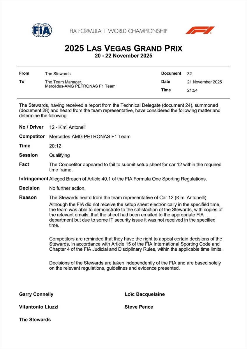 Al termine delle qualifiche valide per il Gran Premio da Las Vegas che scatterà domani, un rappresentante della Mercedes è stato richiamato in direzione gara, per discutere di quanto accaduto durante le qualifiche. Stando infatti al documento numero 24, diramato dalla Federazione Internazionale alle ore 20:12 locali, la scuderia guidata da Toto Wolff non ha presentato entro il tempo limite i dati tecnici legati al setup di entrambe le vetture, infrangendo così l'articolo 40.1 del regolamento sportivo di Formula 1 della FIA.