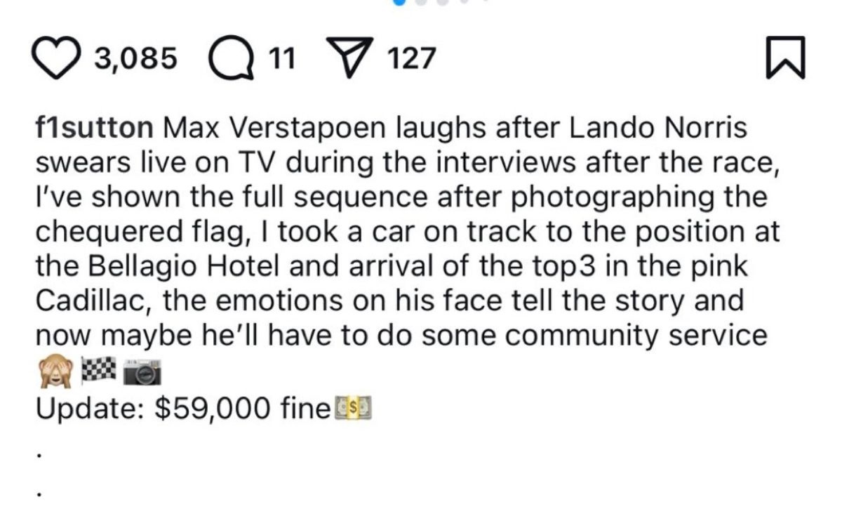 Questa volta, invece, la sanzione sarebbe stata economica: secondo quanto riferito dal fotografo Mark Sutton, Norris avrebbe ricevuto una multa di circa 59 mila dollari, anche se al momento, però, non esiste alcuna conferma ufficiale e lo stesso Sutton ha successivamente rimosso dal suo post la descrizione in cui riportava la cifra. Lo screen che segue risale infatti alla giornata di ieri.