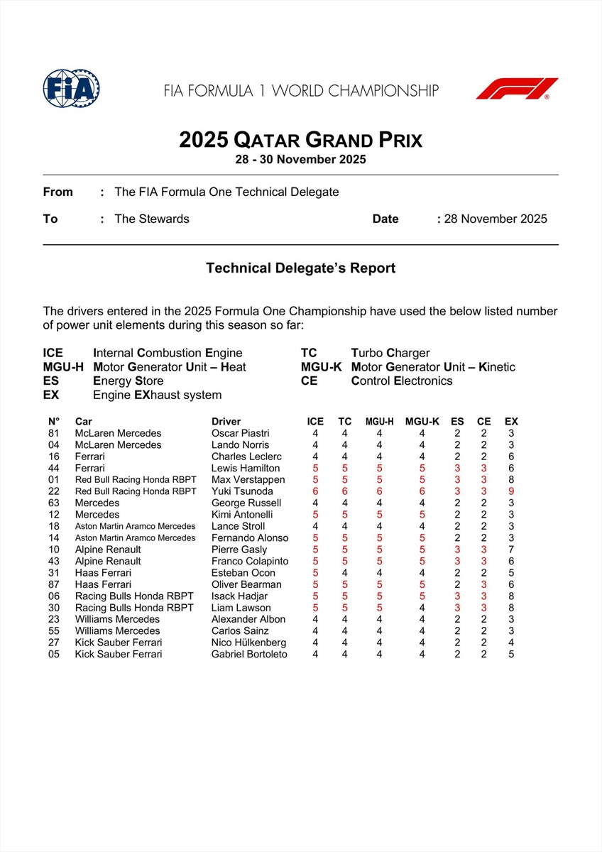 Oltre i limiti (quota 5 su ICE/TC/MGU-H/MGU-K): Max Verstappen, Lewis Hamilton, Yuki Tsunoda, Fernando Alonso, Pierre Gasly, Kimi Antonelli, Franco Colapinto, Bearnan, Hadjar e Liam Lawson. Ogni ulteriore sostituzione comporterà almeno 5 posizioni di penalità.
