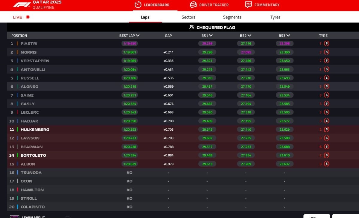 19:52 - Piastri in P2 a soli 35 millesimi: 1'19''530. Hadjar terszo in 1'20''114, Sainz in 1'20''707
