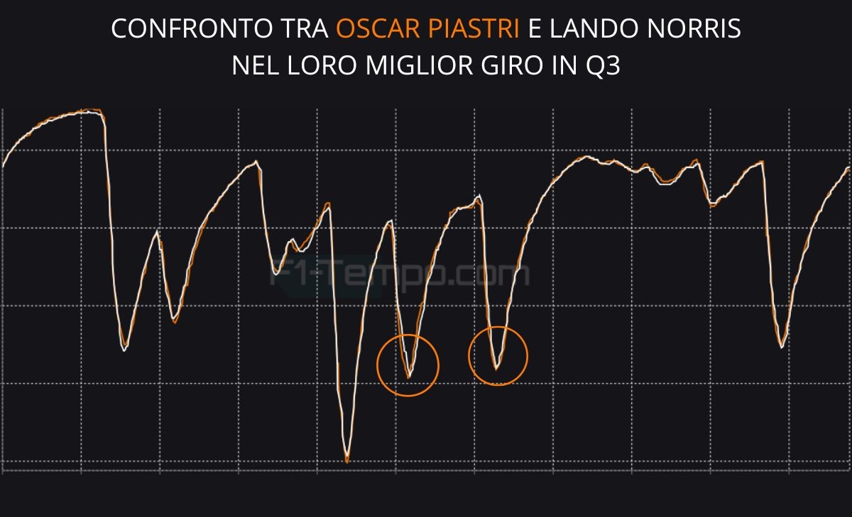 Come successo anche nelle qualifiche Sprint del venerdì, infatti, l'approccio aggressivo di Norris - volto ad attaccare la curva con una maggiore velocità al punto di corda - non paga nella fase di trazione, dove invece Piastri è più lineare.