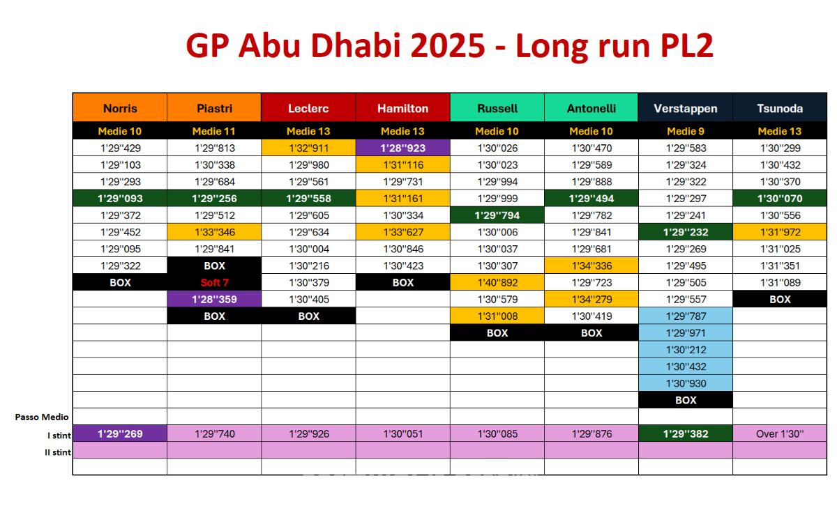 Norris è stato velocissimo, ma Verstappen, tolti una manciata di giri al termine, che abbiamo opportunamente escluso dal conteggio del passo gara (check sulla durata della C4 da parte dell'olandese), è rimasto nei suoi scarichi risultando più lento soltanto di poco più di un decimo al giro. Ci attendiamo una lotta serrata per la vittoria dell’evento, e per esteso, anche del mondiale.