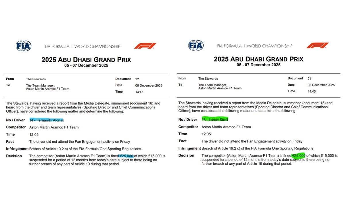 Ciò che a noi è saltato all’occhio però è la sanzione che la FIA ha consegnato all’Aston Martin. Alonso e Stroll non hanno partecipato all’attività di coinvolgimento dei fan al venerdì, e per questa loro mancanza, la Federazione ha comminato al team una multa di 25,000 Euro a testa. Un totale di 50,000 Euro per non aver partecipato ad un incontro con i fan.