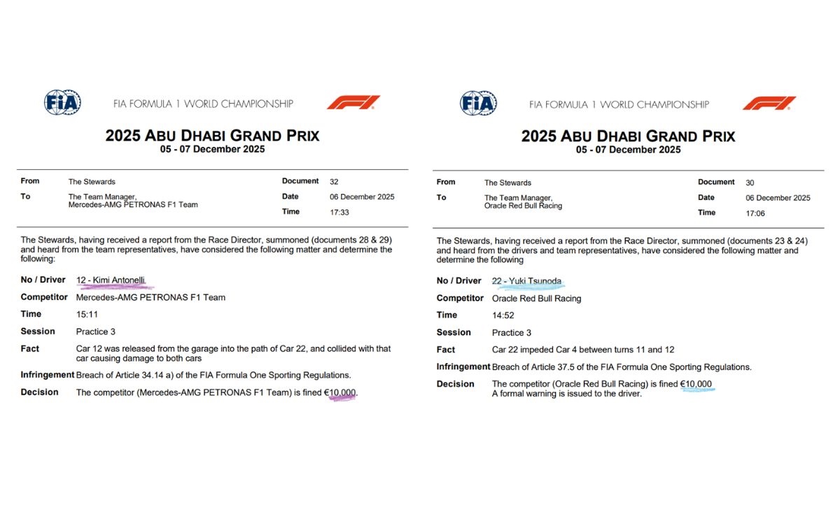 Multe che a nostro avviso sono totalmente incongruenti con quelle comminate al sabato ad Antonelli e Tsunoda. La Mercedes ha ricevuto soltanto 10,000 Euro di multa per l’unsafe release che ha innescato l’incidente tra Kimi e Yuki in pit lane durante le PL3 (contatto che ha causato anche danni al fondo Red Bull).