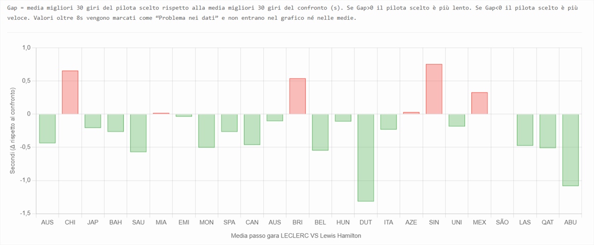 L’analisi del passo gara, ottenuta confrontando la media dei migliori 30 giri per ciascun Gran Premio, conferma un quadro già evidente nelle qualifiche: Leclerc è stato più veloce lungo l’intero arco dei 24 GP, con poche eccezioni legate a situazioni particolari.