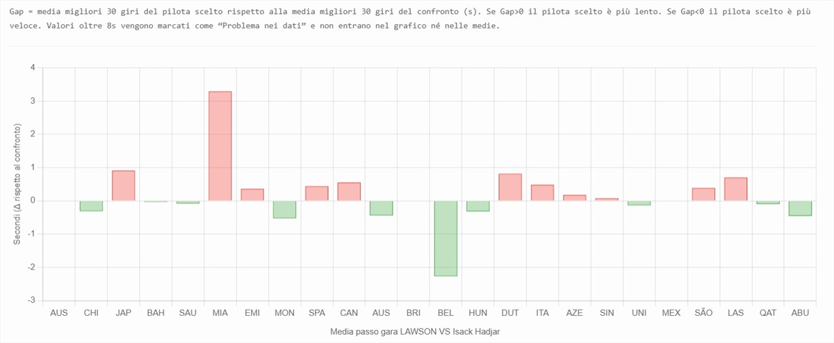 La media dei migliori 30 giri per ogni GP mostra una costanza impressionante da parte del francese. Le barre rosse — che indicano un Lawson più lento — si ripetono tappa dopo tappa, con poche eccezioni. Non si tratta di episodi isolati, ma di una tendenza strutturale: Hadjar è stato più incisivo, più efficace, più solido negli stint lunghi.