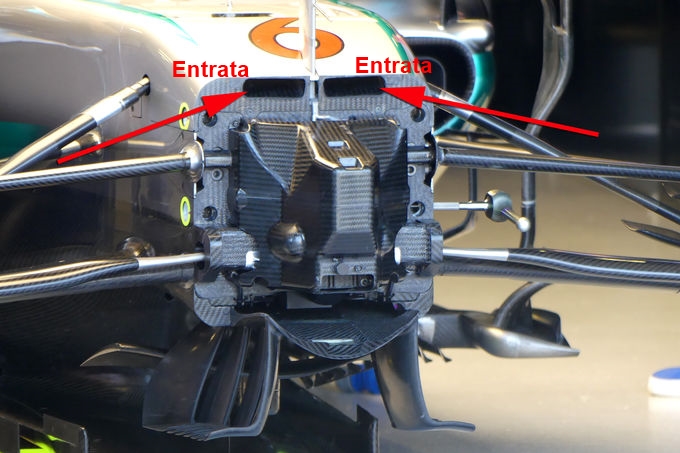 Finalmente, grazie a queste immagini dettagliate, è stato chiarita l'innovazione di cui si parlava nel pre stagione; essa è tutta rinchiusa nei due condotti a forma di S, molto meno pronunciata rispetto alle versioni i Mclaren e Force India, che risalgono all'interno del muso della W07 Hybrid. Sono tali aperture che hanno creato importanti problemi ai tecnici Mercedes nel passare positivamente il crash test frontale. Resta comunque il fatto che la superficie tolta per la creazione dei due condotti a noi non risulta molto ampia.