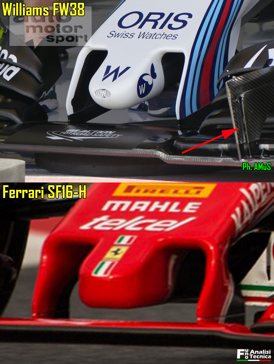 Parlando di concetti aerodinamici, possiamo con certezza dire che il nuovo muso della scuderia di Groove si assomiglia molto a quello montato sulla Ferrari SF16-H. Cosi come il Team italiano, la Williams continua a privilegiare un concetto da lei introdotto nel 2014: quello di far passare più flusso d'aria possibile all'interno dei piloncini di supporto dell'ala anteriore. Per concludere, questa versione di muso doveva debuttare nei secondi test di Barcellona, ma alcuni problemi durante i crash test hanno fatto slittare l'introduzione in pista.