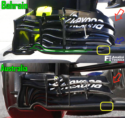 La quarta, segnata in rosso, è relativa ai nuovi flap superiori, completamente rivisti e ridisegnati, ed ora più vicini alle soluzioni utilizzate dagli altri top team soprattutto nella parte interna (ora molto più rotondi rispetto alle soluzioni precedenti).