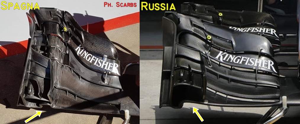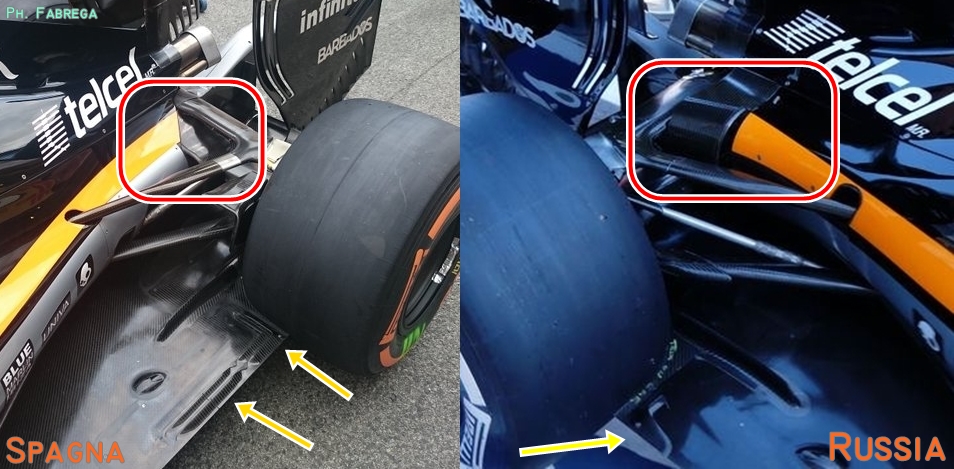 Dal confronto sopra mostrato si può notare come gli ingegneri del Team indiano abbiano modificato la parte di fondo alle ruote posteriori, la parte che va a limitare l'interazione tra gli effetti deleteri relativi al rotolamento degli pneumatici posteriori con l'effetto positivo principale ossia la generazione di carico aerodinamico tra fondo e diffusore. Entrando più in dettaglio sono stati aggiunti due slot davanti a quelli a forma di L, utilizzati ormai da molti Team di F1; slot ad L che anch'essi sono stati modificati sia in numero (ora 2) che in forma (la L è più accentuata).