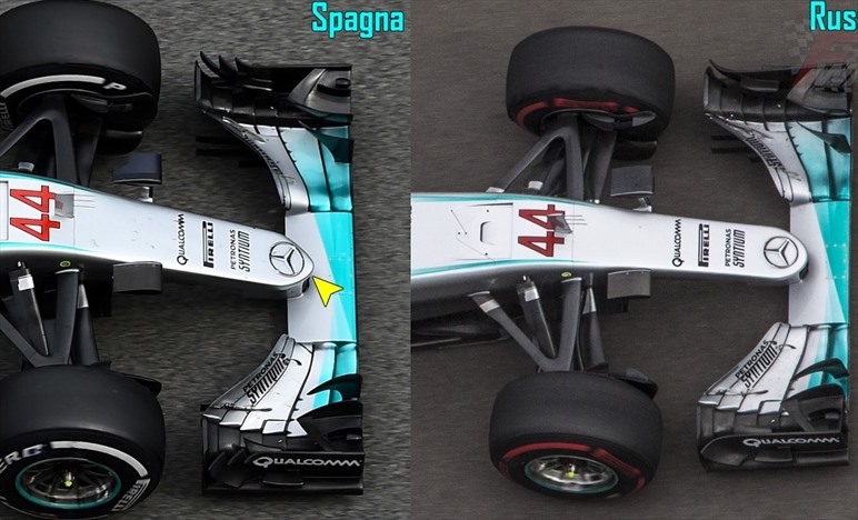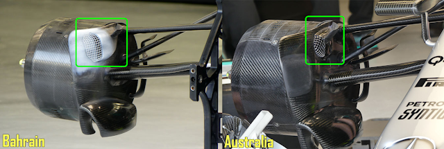 3) A Sochi, in Russia, la Mercedes è tornata alla versione di presa d'aria pre Gran Premio del Bahrain ossia con dimensioni minori. Ma la novità è situata anteriormente a ciò; come potete notare dall'immagine sotto mostrata è stata eliminata la rete metallica utile ad evitare l'ingresso di detriti che potrebbero creare notevoli problemi di raffreddamento ai freni anteriori. La rete metallica è stata sostituita con delle piccole lamine orizzontali che hanno la stessa funzione con il vantaggio di disturbare in maniera minore il flusso d'aria all'ingresso della presa.
