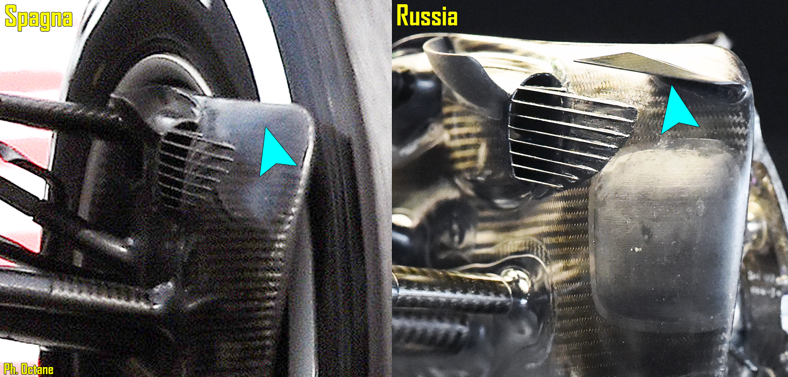 Come ben visibile dall'immagine confronto sopra mostrata, è stata modificata la lunghezza delle tre soffiature principali (in giallo) che ora dividono i turning vanes in quattro parti completamente separate nella parte bassa. Oltre a questa modifica, sono state allungate le soffiature secondarie (in rosso). Modifiche che potrebbero garantire una miglior qualità dei vortici che si staccano dal particolare elemento aerodinamico e che vanno a interagire con il grosso vortice creato nella parte interna dei flap superiori dell'ala anteriore. L'interazione tra questi vortici è fondamentale per riuscire a generare correttamente il giusto carico tra parte centrale e posteriore della vettura.